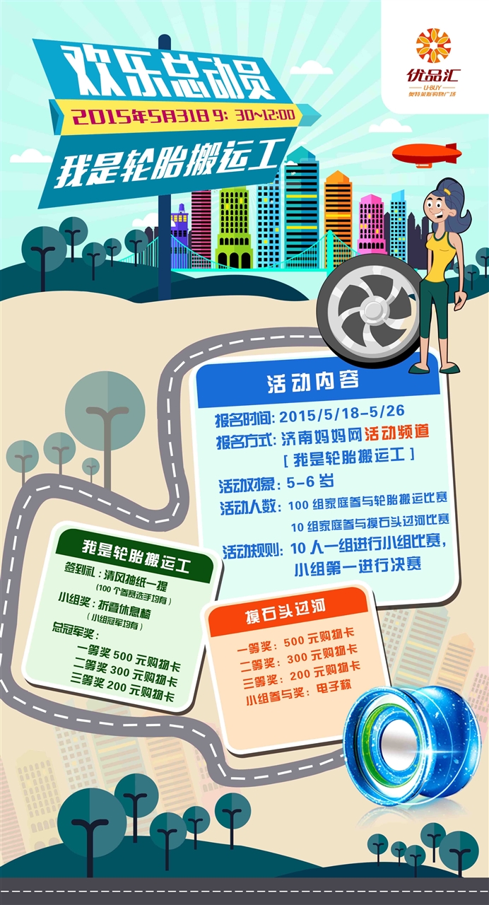 這個六一兒童節(jié)你打算怎么過?玩電腦?看電視?還是大吃一頓?來優(yōu)品匯吧,給你一個與眾不同的歡樂兒童節(jié)!5月31日,優(yōu)品匯“歡樂總動員 我是輪胎搬運(yùn)工”活動歡樂上演!玩游戲、贏大獎,何樂而不為,5月31日,我們等你全家一起出動~報名時間5月22日—5月26日,僅限100組家庭奧!