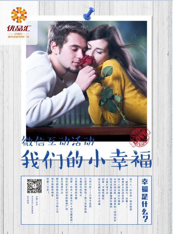 幸福是什么?兩個人一起分享一碗冰激凌、一起去看場電影、一起去窮游四方。。。。。,其實幸福很簡單,就是無論何時何地始終有你陪伴,一路上收藏點點滴滴的歡笑,在一往情深的日子里細數那些甜蜜幸福的美好。8.8—8.15,只要將你和她/他3張能體現幸福、快樂的照片分享到微信朋友圈,回復“姓名+聯系方式+朋友圈截圖”到優品匯奧特萊斯購物廣場官方微信平臺,即可獲得魯信影城七夕情人節當天電影票兩張,限量10名!