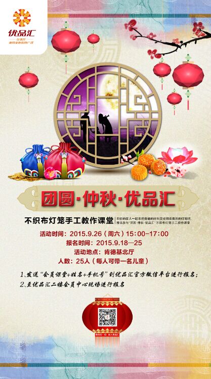 中秋節又要到了,月餅肯定是要吃的,光吃月餅那可不算一次圓滿精彩的中秋節,讓我們一起動手給中秋節加一點心意吧!燈籠是我國傳統文化的典型元素之一,也是逢年過節喜慶吉祥的象征。和你的家人一起來把普通的材料變成精美喜慶的燈籠吧,報名參與9月26日的“團圓·仲秋·優品匯”不織布燈籠手工教作課堂吧!9月18日—25日你可以1、發送“會員課堂+姓名+手機號”到優品匯官方微信平臺進行報名;2、至優品匯二樓會員中心現場進行報名,快來優品匯過一次不一樣的中秋節吧!。