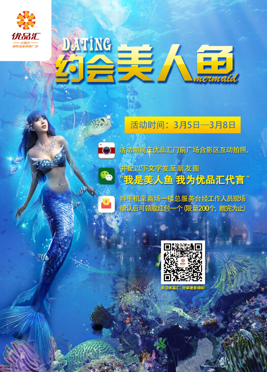 約會美人魚,百份紅包大派送!3月5日至8日,只要您到商場一層外廣場與美人魚合影,并配文“我是美人魚 我為優品匯代言”分享至朋友圈,即可獲得購物卡紅包一個,數量有限,贈完為止,先到先得嗷!