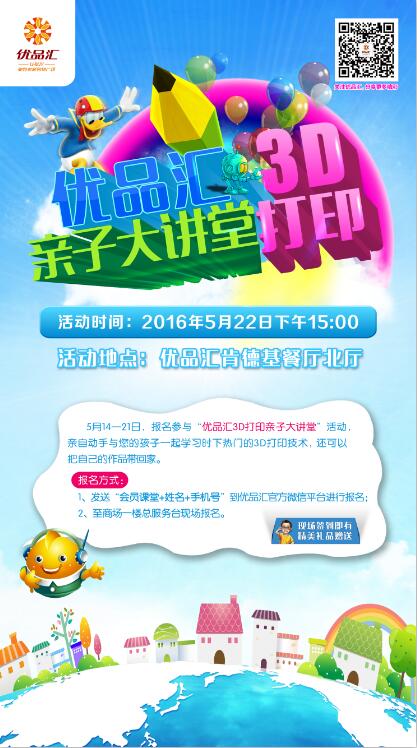 您想讓孩子學習時下最熱門的3D打印技術嗎?您想把孩子親手制作的3D玩具帶回家嗎?3D打印親子大講堂來啦!就在5月22日優品匯奧特萊斯購物廣場!5月14-22日火熱報名中,快來體驗吧!
